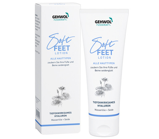 Water lily & silk for well cared legs and feet. GEHWOL FUSSKRAFT Soft Feet Lotion refreshes and nourishes with select active substances. Water lily calms and tightens, silk extract smooths the skin. A specially processed hyaluron is able to penetrate into deeper skin layers to store moisture there. Soothing for tired, heavy legs – supported by red algae extract. Avocado oil and phytosqualane counteract dry, coarse, scaly skin and reduce moisture loss. The lotion is easily spread and rapidly absorbed. For the experience of light, silky soft nourished legs and feet.